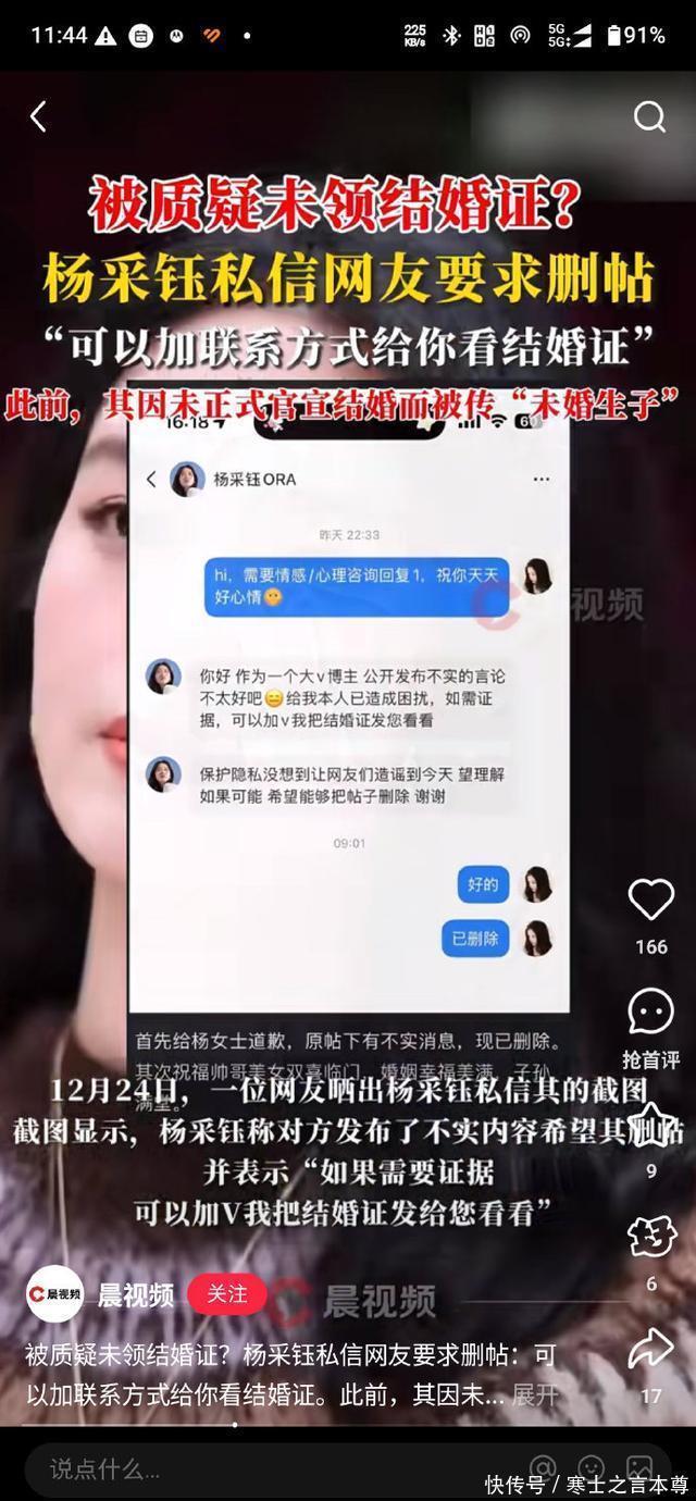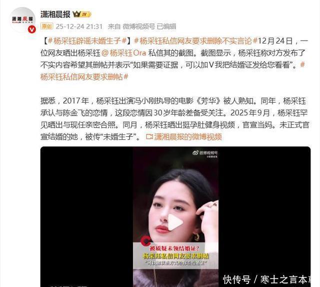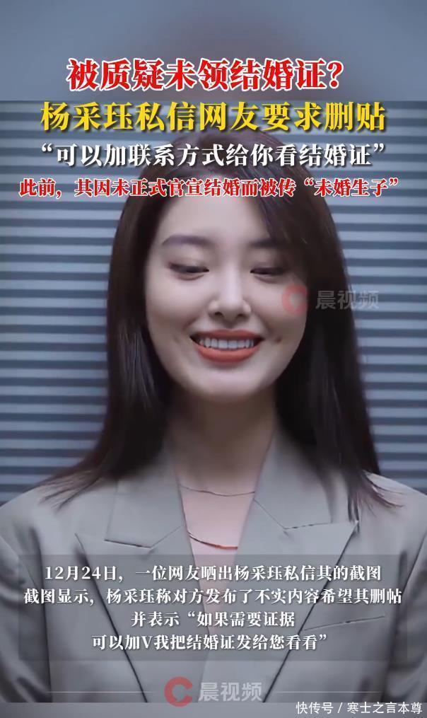 一句“可以加V我把结婚证发给您看看”,让杨采钰以一种意想不到的方式登上了热搜。12月24日,她亲自下场,私信要求发布“未婚生子”传言的网友删帖,并直接甩出“结婚证”作为证据,这波操作被网友戏称为“辟谣界的直球选手”。